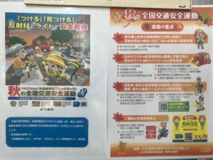 こんにちは! 9/21(日)~9/30(日)の期間秋の全国交通安全運動が実施されます。 日の出・日の入り時間が変わり始め、運転される皆様も歩行者・自転車に気を付けて早めのライト点灯で 交通安全に努めていきましょう! 暑い時期はまだまだ続いておりますが今日も一日ご安全に!