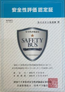 こんにちは! 去る9月25日、株式会社小禄運輸おろくバスは貸切バス事業者安全性評価認定委員会より 安全性評価認定を頂きました。 交通ルール遵守の徹底と、日頃よりご利用頂いておりますお客様の安全・安心を最優先に これからも一層、株式会社小禄運輸おろくバス一同、安全運行に励んでまいります。