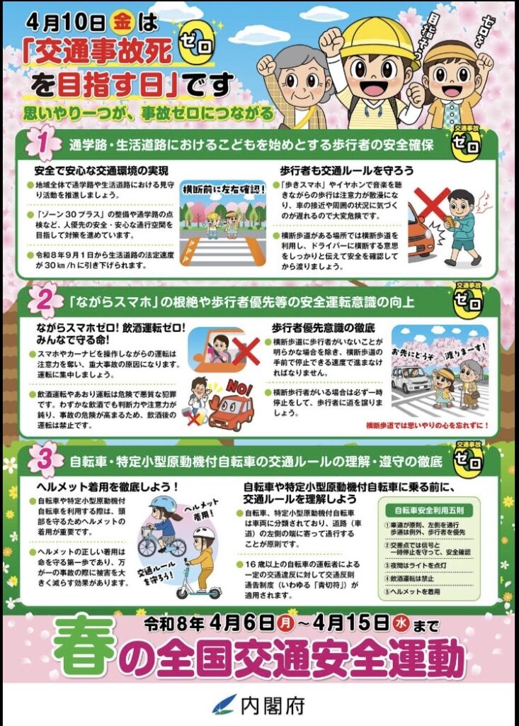 4/10(金)は「交通事故死ゼロを目指す日」です。
